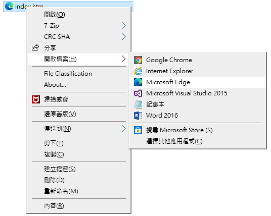 | (說明:網頁瀏覽器若使用其他如 IE、Opera、FireFox等,將可能會造成無法正常使用功能),請在建議書index檔案上按滑鼠右鍵,滑鼠移到開啟檔案之選項,點選 Microsoft Edge 瀏覽器進行開啟,應可正常進入建議書功能畫面。) | |